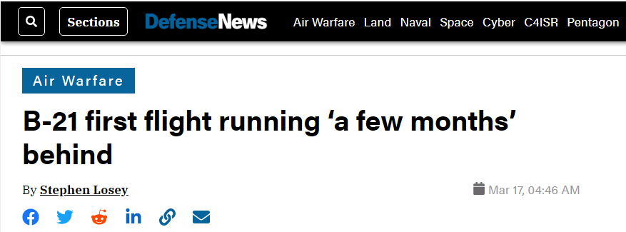 但即便如此,美国空军也迎来了一次又一次失望。2021 年初,美国空军被迫承认,B-21无法在当年首飞,并将时间表推迟到2022年年中。2021年底,美国空军和诺斯罗普·格鲁曼公司的官员在声明中变得更加谨慎,只表示将在2022年推出原型机,“首飞将在稍后进行”,但还没有放弃在2022年首飞的计划。2022年年底,迫于外界压力的美国空军相对低调地公开B-21的外形,但承认B-21的首飞时间再次推迟到2023年。如今,看样子连2023年这个时间期限也难保了……