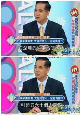 而在台视的一档节目中,嘉宾说有一次她在内地采访,内急想上厕所,按照工作人员的指示去了个厕所,“我一去看。是一排排水沟,连绵有一公里,上百个白白的屁股排成一排。还此起彼落,两个人面对面还可以聊天……”“内地人不说洗手间而必须说厕所,内地的厕所很多都没有门,即使有,内地人也大都不关门!”
