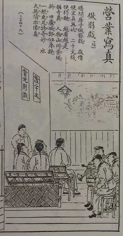 四马路影戏之喧哗:西人有电光影戏,固绝无声息之美剧也。乃观于四马路之影戏场则不然。有雇佣洋鼓洋号筒者,喧哗之声不绝于耳。是与西人适成一反比例也。绘影戏喧哗图,并缀“五更调”形容之:一更一点月吐光,影戏闹忙,呀呀得而哙,将要开场。乌都乌都啥花样,号筒响,声气真长,呀呀得而哙,吹得头胀。二更二点月横空,大鼓蓬蓬,呀呀得而哙,耳朵震聋,人山人海门前拥,脚勿动,朝里望望,无啥影踪,呀呀得而哙,大家勿懂。三更三点月儿高,锣鼓乱敲,呀呀得而哙,看客坐牢,歇子半刻做一套,好心焦。难得看见,倒说真好,呀呀得而哙,片子勿少。四更四点月更明,影戏做停,呀呀得而哙,帐目结清,为啥勿听洋钱叮,无开心,市面坏呀,生意不灵,呀呀得而哙,铜钱难寻。五更五点月向西,看客回去,呀呀得而哙,一路鸡啼,想想刚刚看影戏,真拥挤,好热闹呀,吵得希奇,呀呀得而哙,阿要神气。