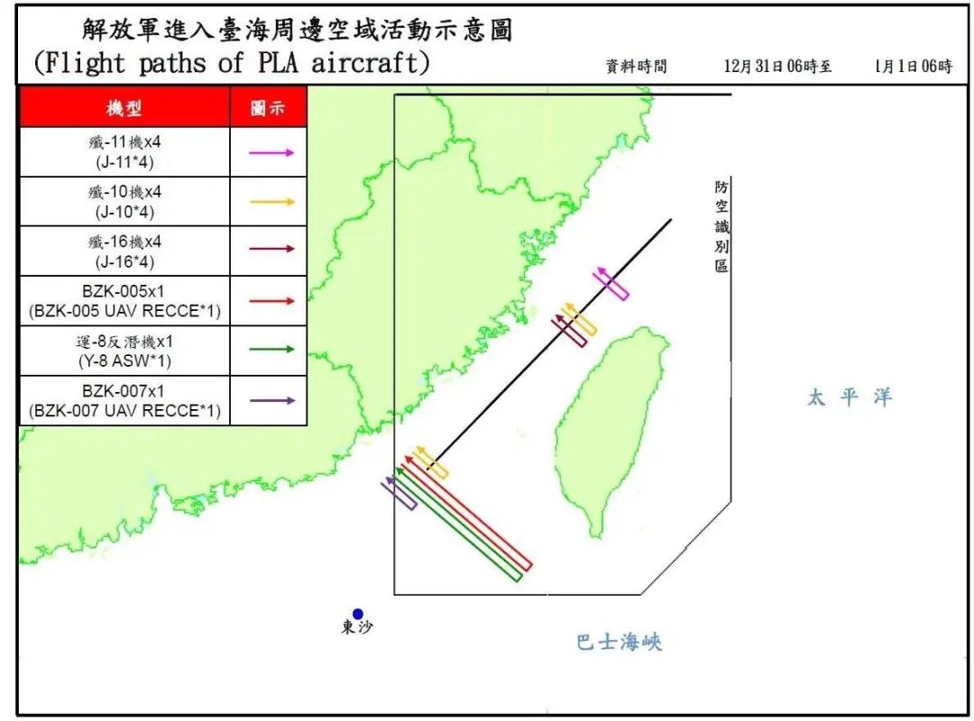 据TVBS新闻网等岛内媒体报道,在央视发出报道的前一天,台防务部门发布通报称,在岁末年初之际,解放军仍旧在一天时间里,出动了24架军机在台海周边活动。其中有4架歼10与4架歼16战机,一度飞越所谓的“海峡中线”,逼近到了桃园与新竹外海约24公里空域,还有4架歼11战机在更靠北的位置,同样飞越了“海峡中线”。台防务部门紧急起飞战斗机前往应对。但在通报之中,台防务部门没有提起歼20战机。