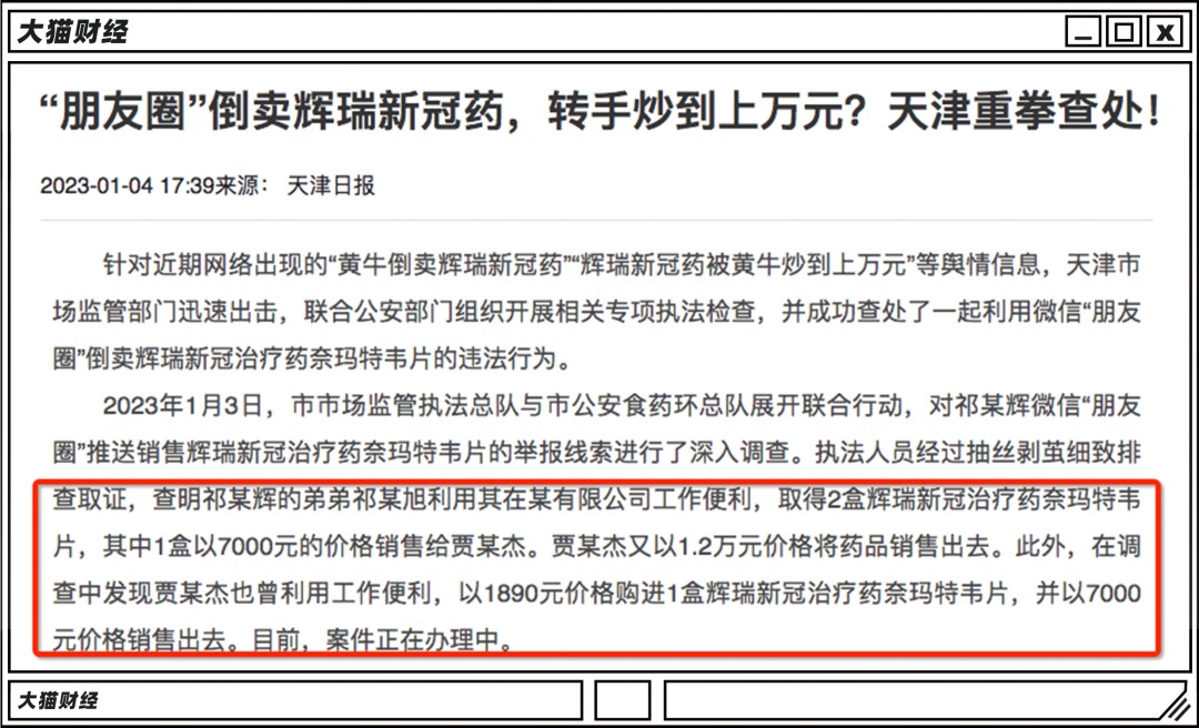一盒售价2980元的辉瑞新冠药Paxlovid,第一次转手,可以加价到7000元,二次转手,售价就变成了1.2万,过了两个手,价格涨了3倍多,当然,如果进价更低,赚得也就更多。