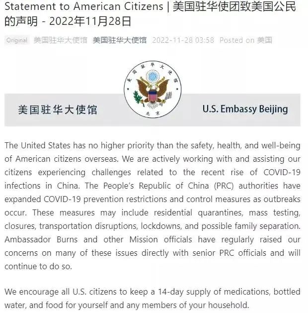 第二次印象深刻的,是在我们的新十条出来之前一个多星期,当时是11月28日,美国驻华大使馆发文,提醒在华的美国公民,提前储备14天的饮用水,食品药品等物资。当时很多人对此不以为然,事后再看,这个提醒和这些准备,应该说还是是及时的。但是这个提醒,应该说有水平,但是还没到惊为天人的程度。