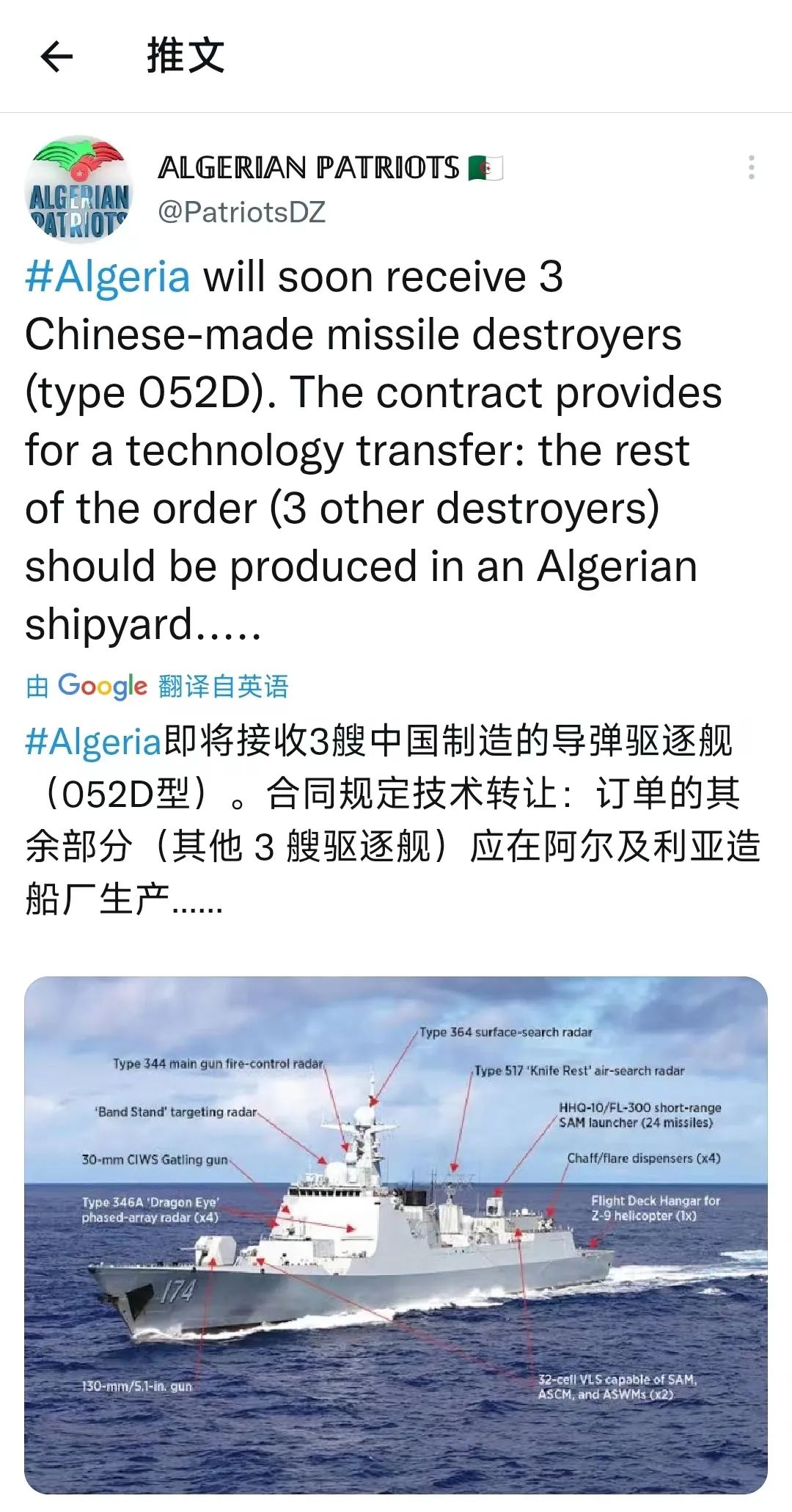 昨天,有阿尔及利亚推特消息,说阿尔及利亚海军正在和负责中国军用船舶出口贸易的中船工业贸易公司进行谈判,向中国引进3艘052DE型防空驱逐舰。更令人惊讶的是,这个阿尔及利亚消息来源还指出,除了首批3艘舰,阿尔及利亚海军还意向引进后续3艘。而且,后续这3艘主要由阿尔及利亚的军船工业自主制造,也就是基本完成技术转移。