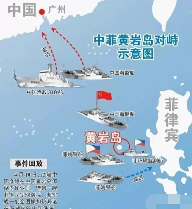 2012年4月12日,黄岩岛事件爆发,12艘中国渔船在黄岩岛潟湖正常捕鱼时被一艘菲律宾军舰干扰,菲律宾军人甚至试图抓捕被堵在潟湖内的中国渔民。
