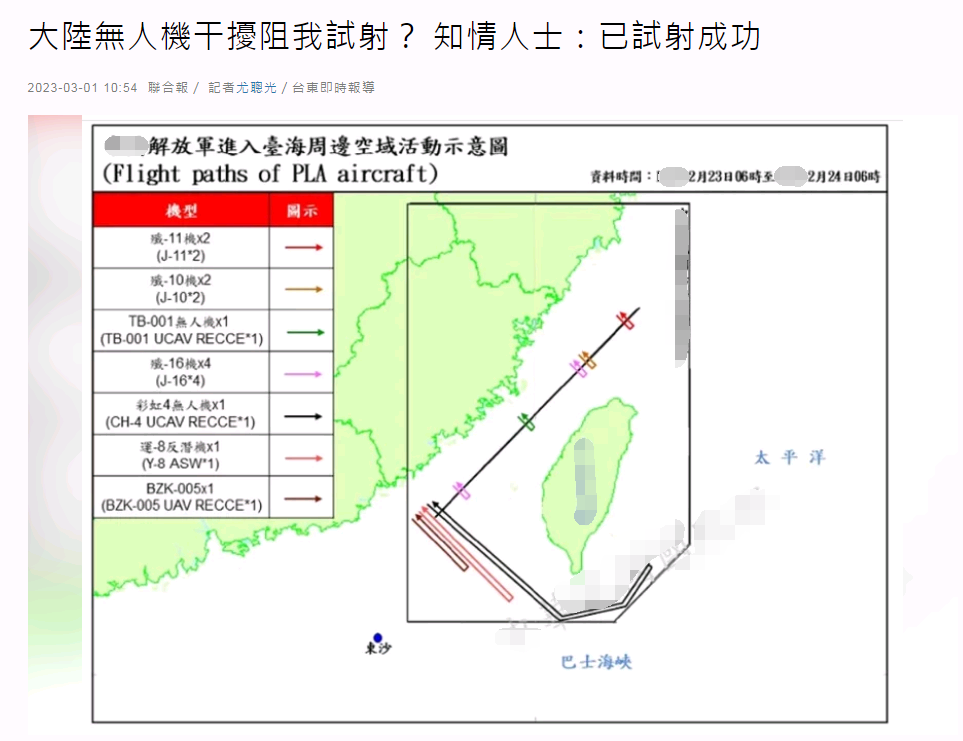 《联合报》强调说,可挂弹的“彩虹-4”无人机直闯台“东南空域”,并接近兰屿。“这正好是‘中科院’试射导弹的时间点,岛内军事爱好者在相关通报网页时发现,台军取消了试射公告,由此认定大陆无人机此举是进行情报收集,台方试射被迫取消。”
