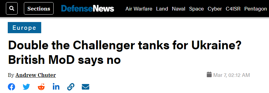 英军武器库存的短缺情况,在支援乌克兰坦克问题上就已经表现得非常充分了。《防务新闻》7日的另一篇报道称,乌克兰驻英国大使瓦迪姆·普里斯泰科此前接受采访时宣称,在乌克兰总统泽伦斯基最近访问英国期间,英国已经同意将援助乌克兰的“挑战者2”主战坦克数量翻倍,也就是从之前的14辆增加到28辆。