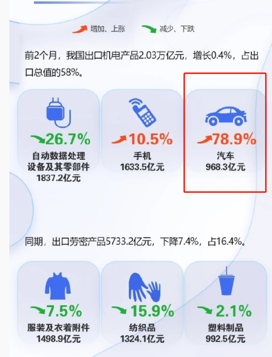 今年1~2月,燃油车销量下降30~40%的同时,比亚迪汽车销量上涨71%,中国汽车整体出口额上升78%。