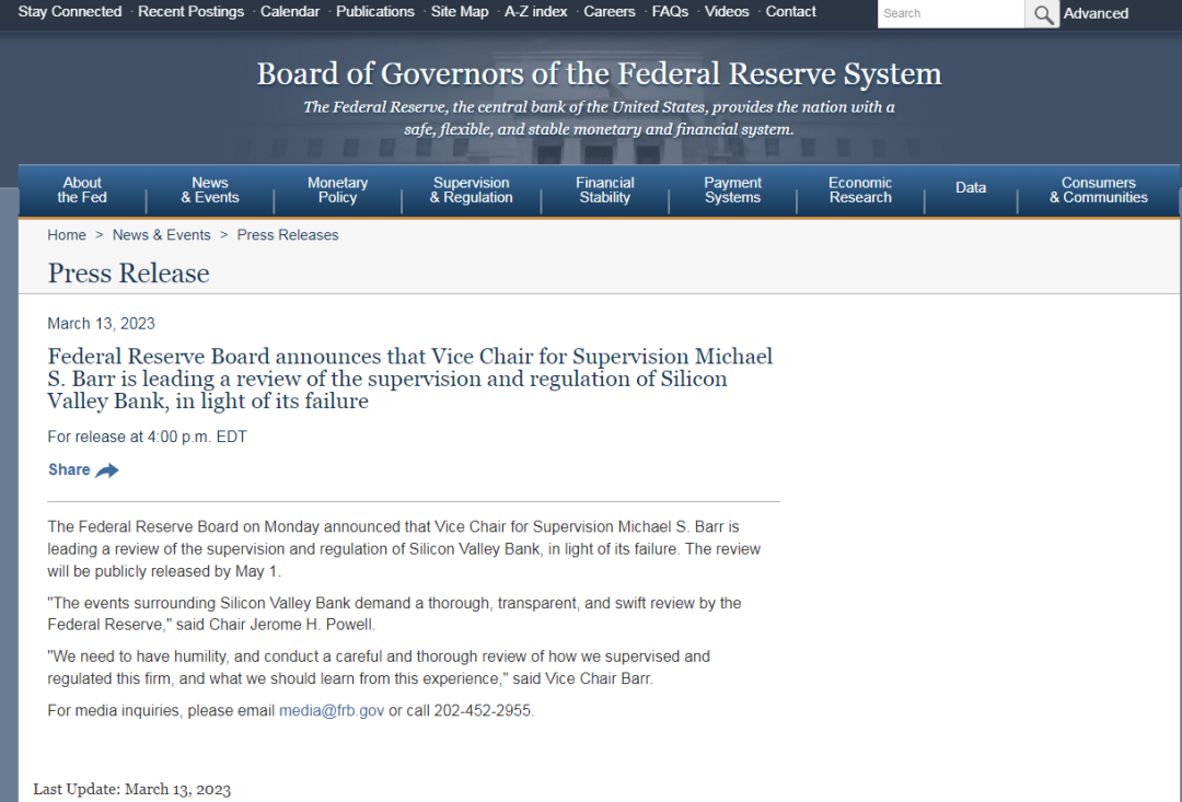 据美联储官网,美联储将调查其对硅谷银行的监管,并于5月1日发布调查结果;美联储主席鲍威尔表示,需要围绕硅谷银行这一事件展开迅速、深入的调查;美联储副主席巴尔将领导此次调查。