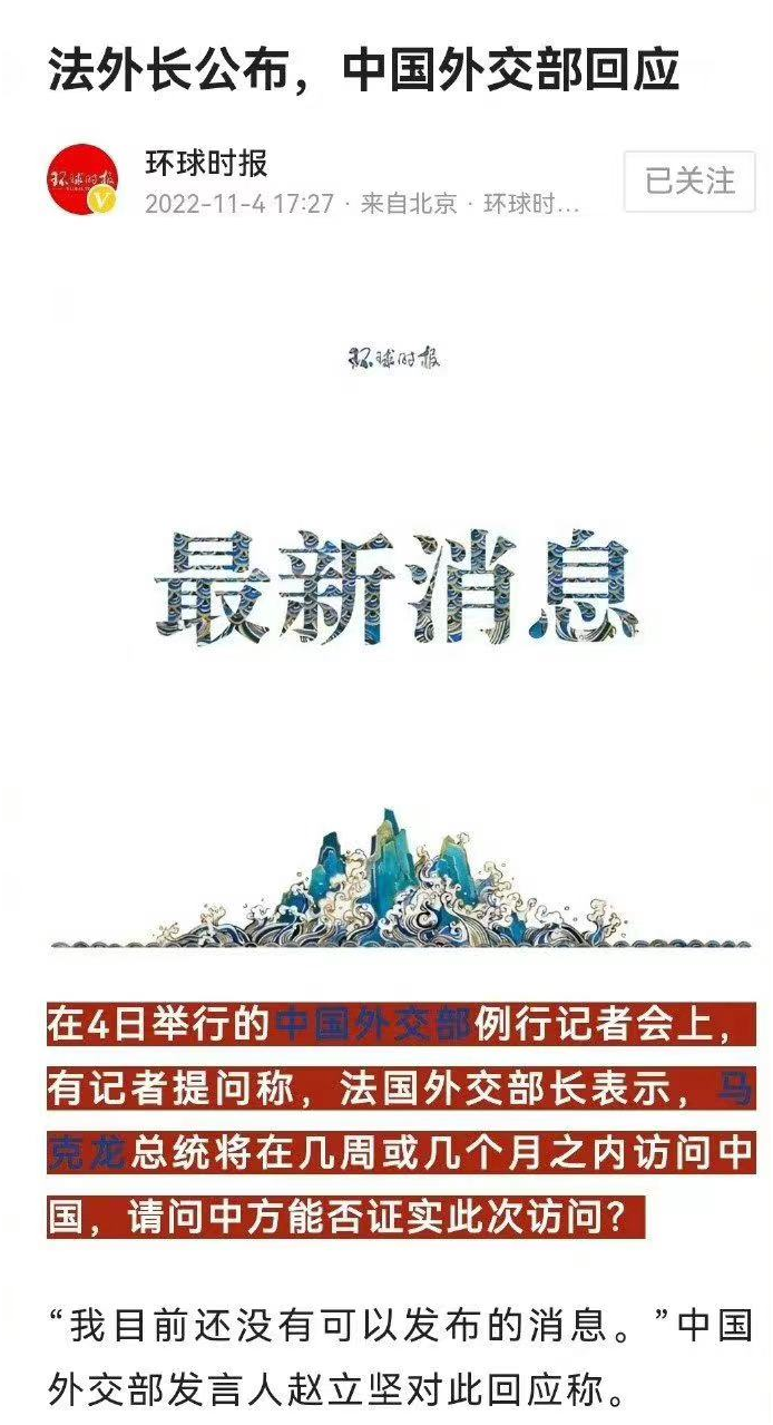 11月4日,针对马克龙要访华的消息,咱们外交部发言人的回应。