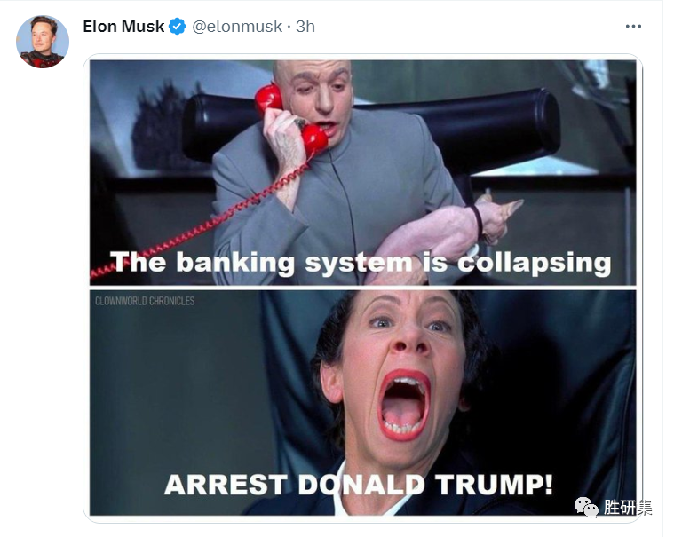 马斯克也是唯恐天下不乱,贴出了一张图片,上半部分是一个紧张的交易员正在电话中呼救,“银行系统正在崩溃!”,下半部分是一个女性政客在尖叫:“逮捕特朗普!”