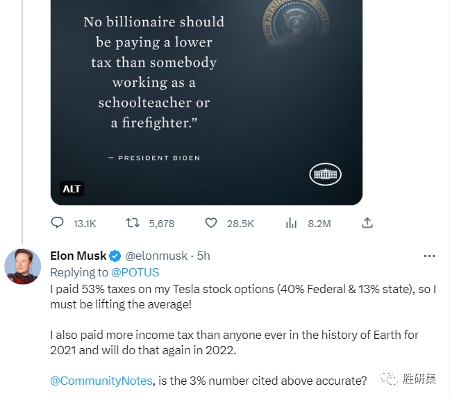 “我为我的特斯拉股票期权缴纳了 53% 的税(40% 联邦和 13% 州),所以我一定拉高了平均水平!