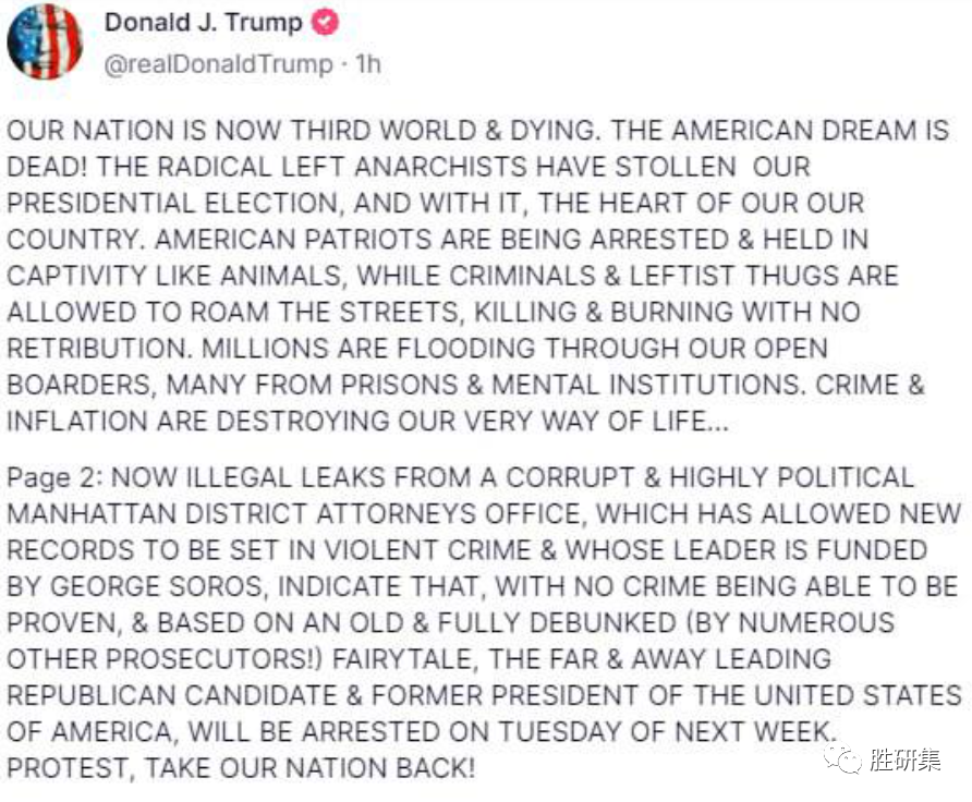 特朗普当地时间18日发文称自己“将于下周二被捕”,并呼吁支持者“抗议”并“夺回我们的国家”。