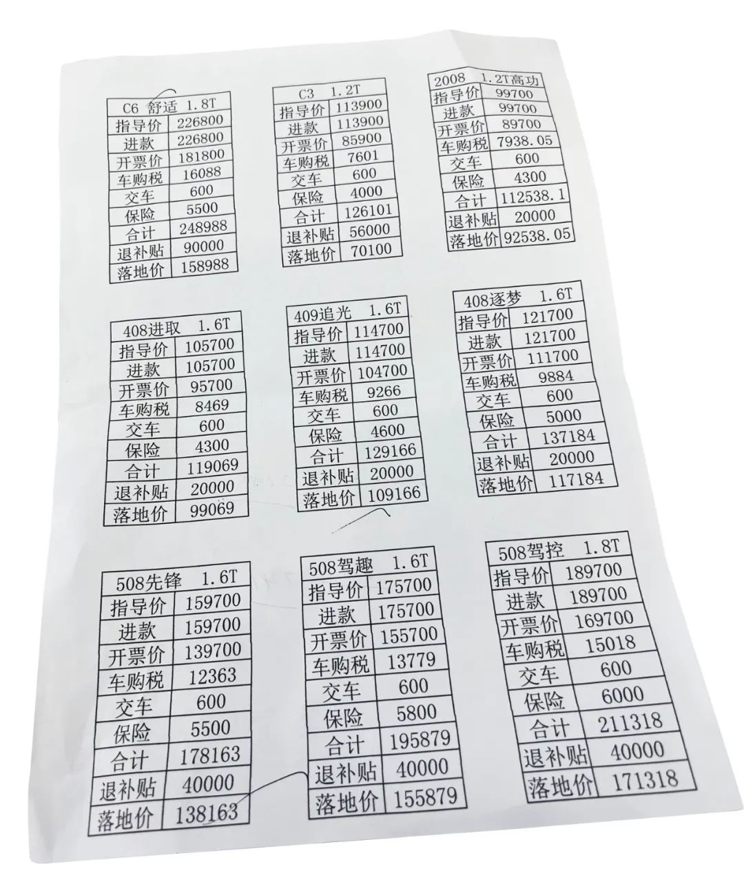 “从3月3日开始,每天来店里看车买车的人暴增,刚开始那两天店里挤满了人,现在优惠力度大的几款车型都卖得差不多了,C6是肯定没有了,其他车型可以交1万元订金,3月20日通知是否有车,无车全额退款。”3月12日,一位东风雪铁龙、东风标致双品牌4S店的销售人员告诉《中国新闻周刊》,以雪铁龙C6舒适版车型为例,指导价22.68万元,开票价18.18万元,另外还有车辆购置税16088元,以及保险、上牌等其他费用,购车合计费用近25万元,政企补贴合计9万元会在一个月后退还,这款车型的落地价接近16万元。