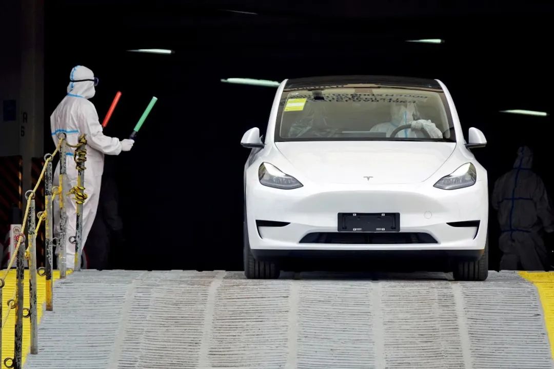 从上海运抵山东烟台港的特斯拉新车。图/视觉中国
