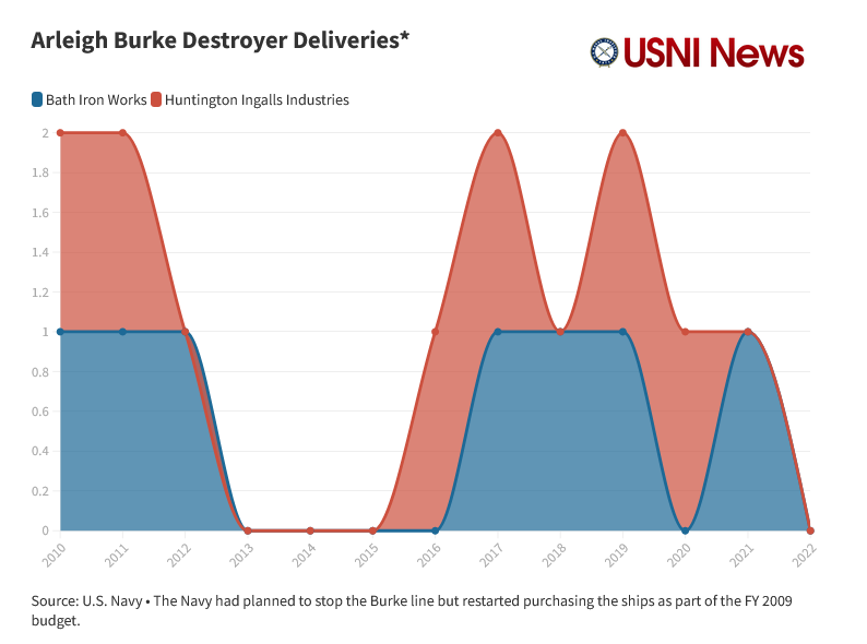 美国海军的两个造船厂在过去十几年中建造“阿利伯克”级驱逐舰的交付记录