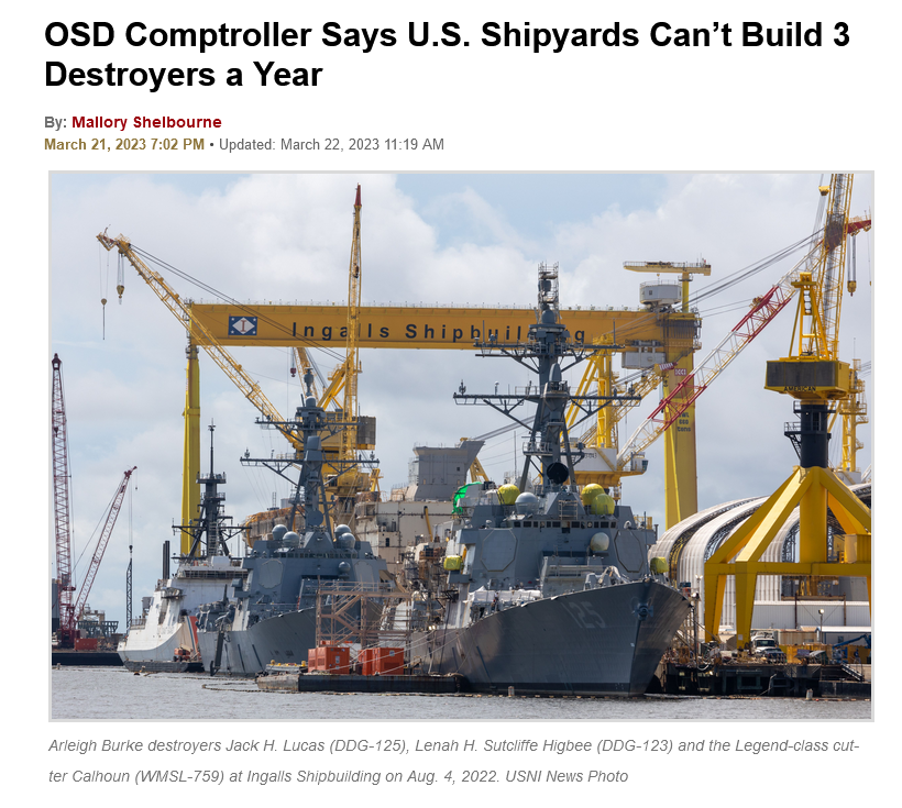 一是美国海军造船厂一年只能建造2艘驱逐舰,连3艘都达不到,造舰速度跟中国没法比。根据美国海军学院新闻网近日报道,尽管美国国会在推动美国海军每年采购三艘“阿利·伯克级Flight III”型驱逐舰,但上周公布的2024财年预算申请显示,美国海军在未来一年只打算采购两艘。这让美国国会的主要议员们很不满,但美国海军有苦难言:目前美国海军造船业的整个供应链都面临熟练工人短缺的问题,不论是建造核潜艇还是驱逐舰,不要说每年建造三艘,建造两艘都困难。