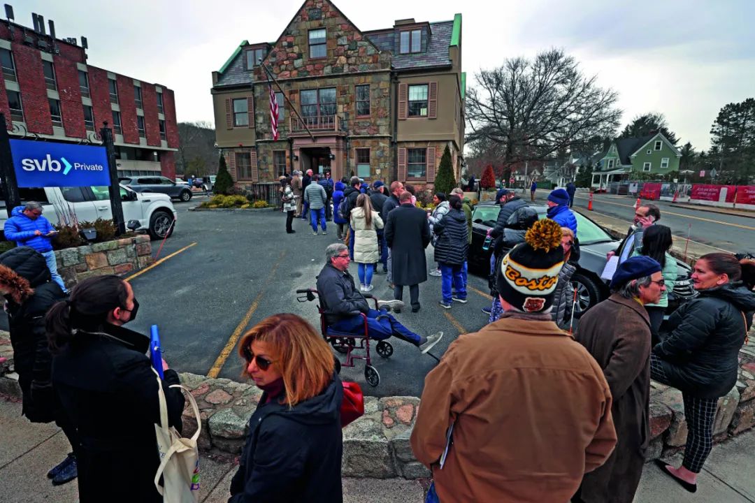 3月13日,美国马萨诸塞州韦尔斯利,在硅谷银行外排队的人群。图/视觉中国