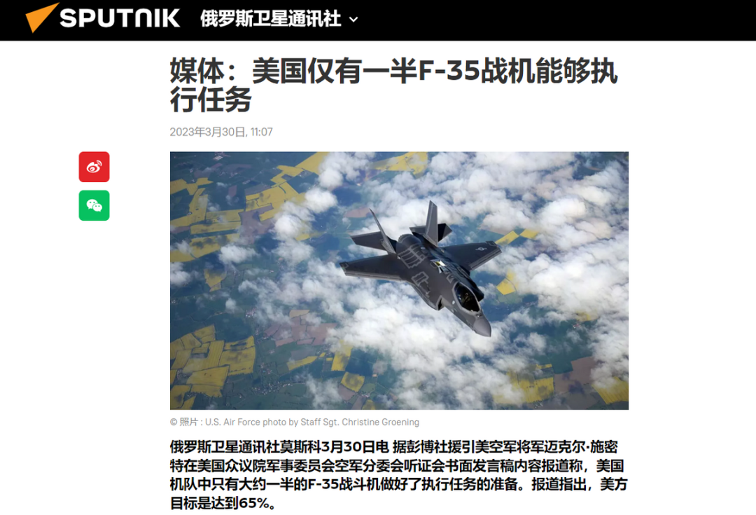 据俄罗斯卫星通讯社报道,美国空军中将迈克尔·施密特在众议院接受质询时承认,截止2月,美国空军F-35现役机队约540架飞机中,大约只有53.1%可以随时升空。《防务新闻》称,其原因是F-35的发动机屡屡发生振动,美军要求它全面停飞,所有已服役的F-35都要在90天内进行检修。