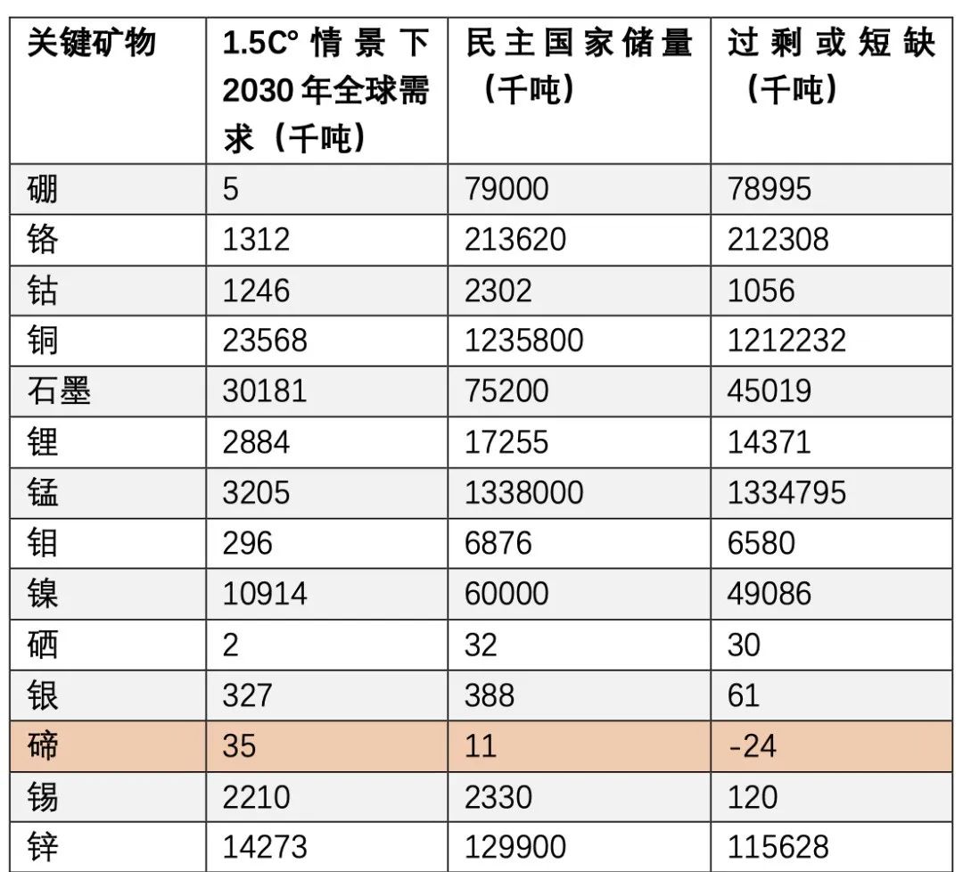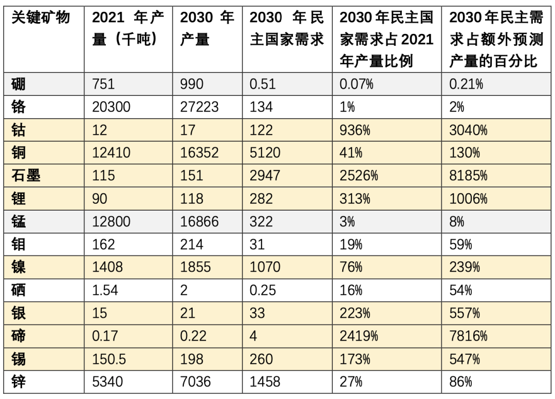 ▲ 表4:所有民主国家关键矿产的生产和需求潜力,黄色栏为潜在短缺