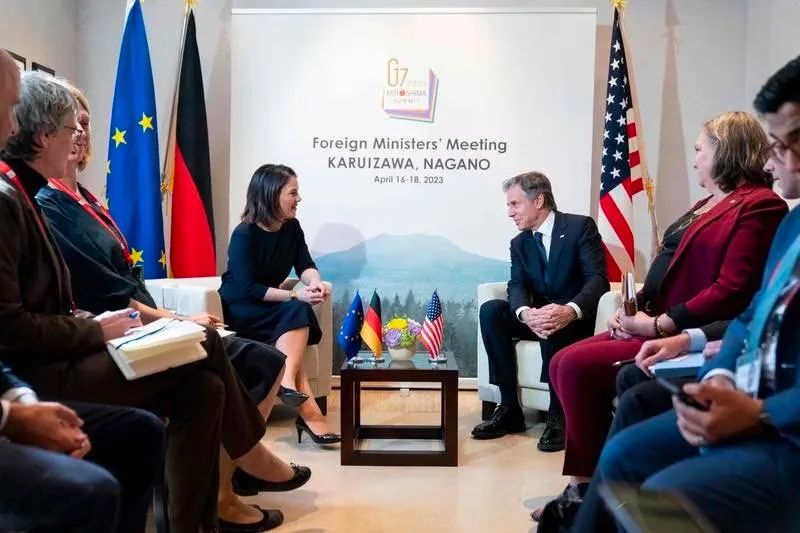 2023年4月,德国外长安贝尔博伯克和美国国务卿布林肯在日本轻井泽举行的七国集团外长会议上(图源:法新社)