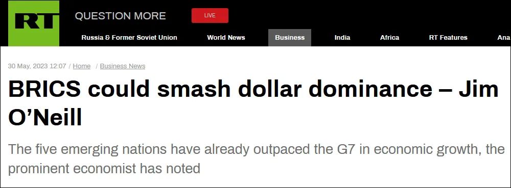 在奥尼尔看来,尽管“去美元化”还未真正发生,但由新兴国家组成的金砖国家可以向美元的霸权地位提起挑战。“我确实认为,作为两个最大的新兴世界国家,如果中国和印度能够在各种事务上达成强烈的一致……那么这可能会加速美元统治地位的结束。”