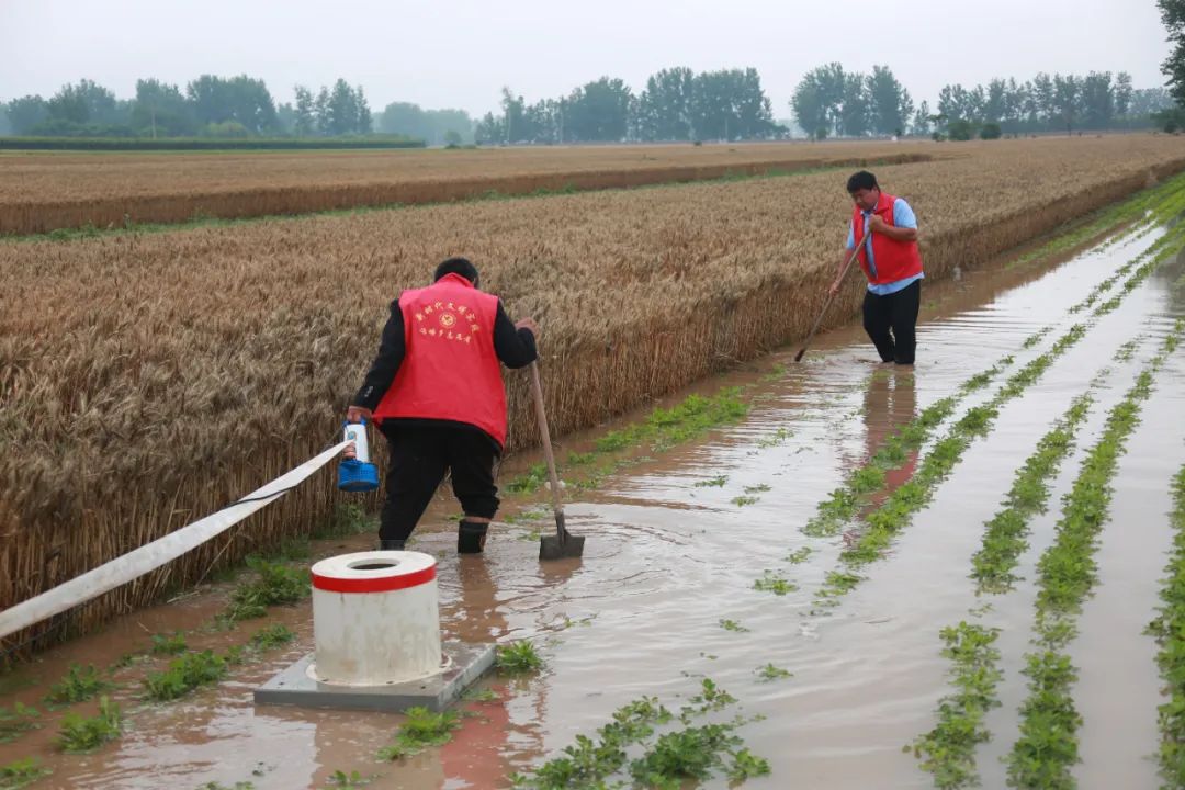 2023年5月28日,河南省周口市淮阳区冯塘乡冯塘村防汛应急小分队志愿者在部分低洼积水的麦田中加紧抽水排涝。图/中新社发 杨正华 摄