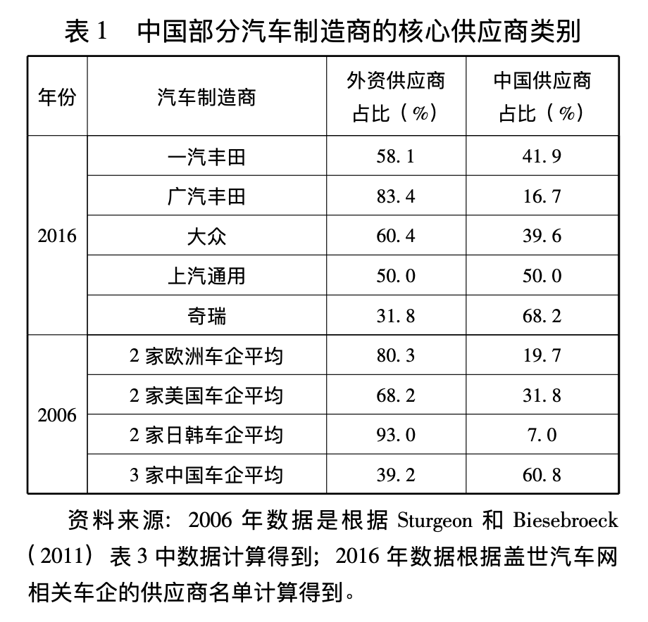中国汽车产业是在跨国汽车巨头陆续进入中国的过程中发展起来的。20世纪90年代中后期,中国开放汽车市场,以“市场换技术”吸引大型跨国制造商以合资方式在中国投资设厂。跨国汽车巨头根据其全球战略布局,在中国设立生产中心,构建价值链。中国企业通过参与跨国公司价值链提升了产能和技能,汽车产业得到发展和壮大。