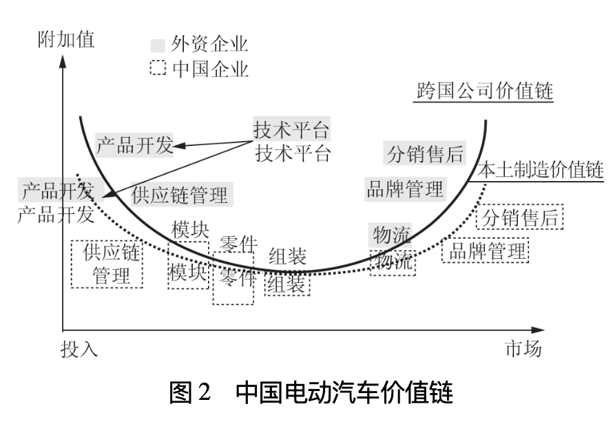图1的汽车微笑曲线显示了跨国公司和本土制造商在中国的汽车价值链结构。跨国公司在母国进行汽车基础研发和系统设计,以及发动机、变速箱等核心技术设计和开发。发动机、底盘和模具等核心部件一般由在中国的独资公司进行生产。在中国的合资公司实施供应链管理、从全球供应商或外资一级供应商采购部件或模块,设立生产中心进行组装生产,同时还进行品牌管理、分销和售后。产品开发一开始由母公司或区域子公司进行,随着中国市场规模扩大,跨国公司陆续在中国成立研发中心,负责开发适合中国市场的产品。