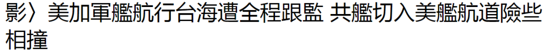 加拿大媒体宣称,美军驱逐舰及加拿大护卫舰6月3日由南向北通过台湾海峡时,一艘中国军舰从美军“钟云”号驱逐舰前方直接切入航道,可能试图逼迫美舰改变航线,在两舰艏最接近时不到150码(约137米),加媒宣称“两舰差点发生碰撞”。