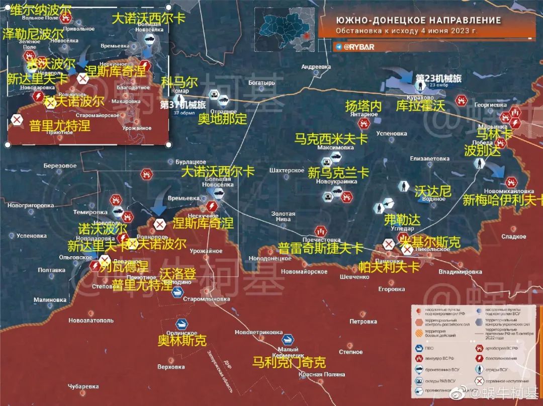 考验俄军的时刻到了!乌克兰四面出击开始“大反攻”,俄乌冲突即将进入新阶段? 2023年6月6日 下午12:09 • 大漂亮国, 欧陆风华, 西风吹 作者:我是大伊万 本文转载自:军武速递(ID:junwu193) 目前,俄乌军事冲突已经爆发466天。昨天,根据俄罗斯一线部队群组消息,乌克兰军队在扎波罗热前线经过火力准备后,发起了全线进攻,经过咱们总结,截止昨天日终时分,俄乌两军的战况大概如下: 在扎波罗热-顿涅茨克南部前线最东端的弗勒达-巴甫洛夫卡镇,乌军使用榴弹炮对俄军阵地展开火力准备和火力侦察,同时继续向弗勒达前线补充部队,俄军则依托卡什拉加奇河组织防御,严阵以待,乌军似乎并没有贸然发起冲击; 扎波罗热方向,遍地都是被击毁的乌军反攻装备 往西到大诺沃西尔卡镇,此地乌军据称动用了50辆各型装甲车、皮卡车实施冲击,一度冲破了俄军的第一道防线,但随后遭到俄军火力拦阻,据称有15辆各型装甲车在冲击中被俄军击毁,残余乌军被迫后撤到攻击出发地; 而大诺沃西尔卡西南方向的新达里夫卡镇、普里尤特涅镇等,乌军似乎动用了营级兵力实施冲击,被俄军击毁了几台装备之后也撤出了战场,同时有消息说乌军新编的第37海军陆战旅已经抵达前线; 装备先进的乌军第47机械化旅 再往西到库班前线,据称乌军同样在新安德里伊夫卡、小托克马奇卡等地实施了进攻,但进攻同样无果。不过另有消息说,乌军“王牌”、装备有M55S中型坦克和M2A2ODS步兵战车的机械化47旅已经抵达库班,同时抵达库班的起码还有乌军的2到3个旅战斗队,这些北约旅基本处于齐装满员的状态。 纵观扎波罗热方向的昨日战况,乌军动用的部队除了在大诺沃西尔卡方向,可能直接动用了旅级兵力进行主攻,在大诺沃西尔卡侧翼、古列波利、库班这三个进攻方向上,进攻兵力都在营一级甚至连一级。同时,乌军昨日继续在其它战线展开袭扰,据称在别尔哥罗德战线,乌军一昼夜对别尔哥罗德的舍别基诺区炮击高达500次,其中对舍别基诺村的炮击就高达300次。 别尔哥罗德遭乌军炮击次数统计 不过,在卢甘斯克战线、阿尔乔莫夫斯克战线、顿涅茨克西部战线等,目前战况还比较平静,车臣“阿赫马特”特战支队加入马林卡战斗之后,甚至又往城西推进了一段距离。 对于乌军昨日的战役战术行动,咱们先说战役层面,再说战略层面。 战役层面 从战役层面,大伊万的整体感觉,乌军似乎是想在大诺沃西尔卡方向有所行动。 毕竟以俄军前线战报来看,这里乌军动用的兵力数量较多。如果真的动用了50辆以上的各型车辆,那么起码是一个坦克连加上一个机械化营的水平,意味着乌军使用了一个旅战斗队的第一梯队进行战斗侦察,那后面必然会有不止一个旅的兵力。作为对比,乌军在其它几个主要进攻地段上,动用的兵力都在营连一级之间,这意味着其它战线上的后方兵力也就是营到旅之间。 在战斗强度上,大诺沃西尔卡镇的战斗也是烈度最高的,根据俄军的一线报告,这里的乌军几乎突破了俄军的第一道防线。当然,俄军的第一道防线基本也就是由反坦克雷场、反坦克壕沟和龙牙工事、外带一层到数层堑壕加上掩蔽部组成的掩护阵地,作为防御体系的前哨,大概率没有多少兵力,主防御带必然在一线掩护阵地的后方。但从乌军能够突破反坦克雷场、壕沟等野战筑城体系的情况看,大诺沃西尔卡的战斗强度超过了其它进攻地段,动用的兵力多、战斗的强度高,那么毫无疑问这里就是昨天乌军的主要进攻方向。 在战役考量上,乌军将大诺沃西尔卡作为主要进攻方向的原因可能有如下几点: 一是大诺沃西尔卡目前作为俄军扎波罗热战线的最北端,位于战线的顶端位置,自身位置比较暴露,可以被认为是战线的突出部,乌军在这里发起进攻,可能是想先打掉这个突出部。这就是为什么乌军在大诺沃西尔卡发起进攻的同时,又在突出部的腰部普里尤特涅发起进攻的主要因素,打头、击腰、断尾,准备将突出部的俄军在战役态势上整体截断; 二是大诺沃西尔卡的战线与东部的巴甫洛夫卡战线呈现出联动效应,二者之间有一条等级相对较高的公路连接。原本乌军可以依托这一公路形成顿涅茨克南部的防御整体,却因为俄军占据了巴甫洛夫卡和大诺沃西尔卡南方的涅斯库奇涅,使得整条防线呈现出支离破碎的状态。不排除乌军试图把俄军从大诺沃西尔卡方向逐退十几千米之后、后续再向东卷击、夺回巴甫洛夫卡并对沃尔诺瓦哈形成威胁,最终向马里乌波尔方向展开跃进。而大诺沃西尔卡本身战役突出部的地位,似乎对进攻方较有利,更利于乌军达成这一战术目的。 乌军在扎波罗热反攻中,被击毁后遗弃的美制防地雷反伏击车 当然,对于乌军昨日的进攻,尽管确实做到了在多个地段同时发起进攻,同时有较为明确的进攻重点,进攻重点体现出的战役意图也比较清晰,但咱们并不能认定此次进攻是战斗侦察,还是真正的主攻。当然以现代战争的特征来看,战斗侦察和主攻之间的分界线并没有多明显。毕竟战斗侦察和战前侦察不同,本身就需要调动一定数量的主攻部队参与,一般直接用第一梯队,后续梯队则做好战斗准备。如果战斗侦察较为顺利,那么可以顺势投入后续梯队实施连续突破,也就是从侦察变为主攻、从佯动变为真正的进攻。如果战斗侦察不顺利,那么可以退回攻击出发地,补充人员装备,提高火力准备强度之后再试一次。 所以