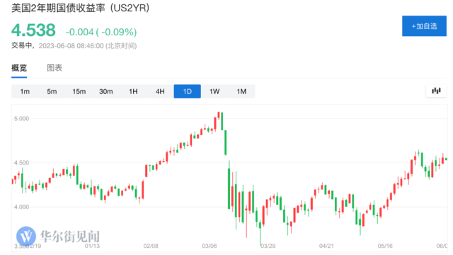 短期债券收益率在最近几周已经大幅上升,两年期国债收益率周三收于4.548%,较一个月前触及的年内低点上涨逾0.8个百分点。10年期国债收于3.782%。