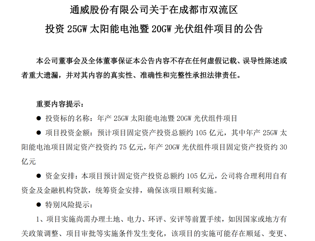 什么信号?又有两家千亿光伏巨头同时掷出百亿投资,方向是…… 2023年6月11日 下午12:33 • 前沿科技, 城市乡村 作者:证券时报 阮润生 本文转载自:e公司(ID:lianhuacaijing) 继晶澳科技加码一体化产能扩建,硅料龙头通威股份(600438)、光伏组件龙头隆基绿能(601012)最新各自斥资超过百亿,投资推进单晶硅棒、光伏组件以及太阳能电池项目,完善一体化布局。 百亿光伏项目落子成都 6月6日通威股份公告显示,全资子公司通威太阳能科技有限公司将在成都市双流区投资建设年产25GW太阳能电池暨20GW光伏组件项目,投资总额约105亿元。 公告显示,全资子公司通威太阳能科技拟与成都市双流区人民政府签署《太阳能光伏产业项目投资合作协议》,就公司在成都市双流区投资建设年产 25GW 太阳能电池暨 20GW 光伏组件项目达成合作。 该项目预计固定资产投资 105 亿元。项目分两期建设,其中一期为年产25GW 电池项目,预计固定资 产投资 75 亿元;二期为年产 20GW 组件项目,预计固定资产投资 30 亿元。一期项目预计将于 2024 年内建成投产,二期项目预计将于 2025 年内建成投产。 通威股份表示,在全球碳中和背景下,公司顺应行业发展趋势,充分发挥自身在光伏产业链中领先的综合竞争能力,继续强化围绕高纯晶硅、高效太阳能电池、高效太阳能组件等核心环节为一体的优势产能结构。 同日,隆基绿能也公告,公司与西安经济技术开发区管理委员会签订《年产20GW单晶硅棒、24GW单晶电池及配套项目投资合作协议》,项目总体规划分为三期,合计总投资约125亿元,其中一期为年产 20GW 单晶硅棒项目、12GW单晶电池项目,预计投资金额 75 亿元(含流动资金);另外,配套隆基全球创新中心项目由 公司或公司下设机构负责,预计投资约 15 亿元。 隆基绿能表示,本项目实施有利于进一步提升公司硅棒和高效电池产能规模,优化公司产 能布局和配比,提高公司一体化产业链竞争优势,提升公司盈利能力。配套隆基全球创新中心项目是为了满足公司未来发展规划和研发运营需求,有利于公司优化资源配置,为公司持续研发创新提供良好的基础设施保障。 另外,该项目预计 2024 年开始投产,不会对隆基绿能当期营业收入产生影响,根据协议规定,二期项目和三期项目将由协议双方结合一期项目实施情况和光伏市场需求情况另行协商,具体实施时间和建设周期存在不确定性。三期项目由双方另行约定投资内容,具体投资内容存在不确定性。 巨头布局一体化 当前光伏龙头企业纷纷发力一体化布局。晶澳科技6月5日披露拟投资60亿元,建设鄂尔多斯高新区年产30GW拉晶、10GW硅片、10GW组件项目,提升公司硅片、组件产能。更多内容请看《千亿光伏龙头宣布!再投60亿扩产》 硅料龙头通威股份高纯晶硅产量连续多年位居全球第一,也从2022年进场光伏组件市场。去年9月,通威股份公告将在盐城市投资建设年产25 GW高效光伏组件制造基地项目,预计固定资产投资约40亿元。 2022年年报显示,通威股份已陆续启动盐城、金堂、南通等组件项目,全年公司出货量进入全球前十名;按照项目投资规划,预计 2023 年底公司组件产能将达到 80GW。 另外,在太能能电池业务上,通威股份保持头部地位。InfoLink Consulting 统计显示,公司太阳能电池出货量自 2017 年以来已连续 6 年全球第一,并于 2022 年二季度成为行业首家电池出货量累计超过100GW 的企业;公司预计今年底高纯晶硅产能将超过 38 万吨,太阳能电池产能达到80-100GW。 隆基绿能作为全球最大的单晶光伏制造企业,单晶硅片和组件出货量均位列全球第一。截至2022 年底,公司单晶硅片产能达到 133GW,单晶电池产能达到 50GW,单晶组件产能达到85GW。 今年3月,隆基绿能投资近78亿元建设鄂尔多斯年产30GW高效单晶电池项目,将导入公司研发的高效N型TOPCon电池技术,量产电池转换效率将达25%以上;4月份,公司斥资近20亿元投资鹤山年产10GW单晶组件项目,在铜川投资35亿元建设年产 12GW 单晶电池项目。 根据产能建设目标,到2023 年底,隆基绿能计划单晶硅片年产能达到190GW,单晶电池年产能达到 110GW,单晶组件年产能达到130GW,计划实现营业收入超过 1600 亿元。 光伏降价风险 在今年SNEC展会上,通威股份发布了优化尺寸设计的TNC-182大矩形片组件,以及210-THC组件新品。 通威组件营销副总经理李岩在接受行业媒体PV-tech采访时表示,公司有一体化垂直光伏产业链,在N型产品上进行了完备布局,并进行全部组件布局,今年第一季度公司位居国内光伏组件中标规模之首。 李岩表示,产业链已经不存在绝对意义上的瓶颈环节,展望全年,随着硅料产能在下半年集中释放,产业链价格下行能够顺利传导,这将极大刺激下游电站的装机需求。因此今年的需求整体来讲应该是非常乐观的。 不过,光伏行业产能过剩、降价风险日趋突出。 就最新的百亿投资,通威股份也提示风险,受政策调整、电站业主融资状况、电网消纳水平、土地供应等因素影响,可能会导致光伏市场需求变化,产品价格发生大幅波动,导致项目收益不达预期。另外,光伏行业技术更新、产品升级较快,市场竞争可能进一步加剧,如公司不能持续保持整体竞争优势,本次项目可能存在盈利不达预期的风险。 隆基绿能董事长钟宝申在第十六届全球绿色能源领袖对话上也提示过光伏产能供过于求的风险。据介绍,过去18年,光伏行业建设了约380 GW的全产业链产能;现在