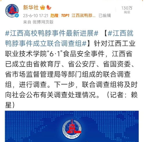 为了一个鸭脖,江西省四大巨头部门成立联合调查组 2023年6月11日 下午1:12 • 城市乡村 作者:一棵青木 本文转载自:远方青木(ID:YFqingmu) 为了搞清楚一个大学生吃到的鸭脖到底是鸭脖还是鼠头,江西省成立了由省教育厅、省公安厅、省国资委、省市场监督管理局等部门组成的联合调查组,把这个鸭脖事件称之为“江西工职院‘6·1’食品安全事件,展开全面调查,此消息由新华社发布。 看到这个消息后我整个人都震惊了,这事就算为真,顶天了也就一个老鼠头的事,最多也就是职业学院的餐厅的一个承包窗口的厨师的问题,结果最终由江西省四大巨头部门成立了联合调查组去追查真相。 你看看这阵容,省教育厅、省公安厅、省国资委、省市场监督管理局,可以说江西省能和这个鸭脖事件擦边的部门全体出动了,而且消息还是由新华社这种顶级央媒郑重发布的。 一个鸭脖/鼠头的小案子,最后通天了。 芝麻大点的案子,何德何能可以通天啊,所以这事的经过必须要回顾一下,让以后的地方相关部门吸取经验教训。 6月1日,江西工业职业技术学院的一名学生在网上发布了自拍的视频,声称自己在学校的食堂吃到的鸭脖是老鼠头。 根据该名学生拍摄的视频,这个鸭脖确实非常像老鼠头,网友看到之后很恶心也很生气,于是愤怒了,给顶上了热搜。 不仅仅有着疑似老鼠头门牙的部位,这个鸭脖还有着黑色毛发,高度类似老鼠头的毛。 仅凭这些视频展示的镜头,质疑这个鸭脖为老鼠头是合情合理的事情。 当然事情也不能那么绝对,因为某些食物在特定的角度下进行展示,确实有可能高度类似其他物种,门牙可以是鸭脖的骨髓,老鼠毛可以是鸭毛被酱油染色烧黑。 所以也没人能仅凭这几张照片和只展示部分角度的视频就笃定这100%就是老鼠头,但很显然更没人敢100%笃定这就是鸭脖。 事情发展到这里,就需要公共部门出场当裁判了,把真相给挖出来公之于众,平息争论,这也是公共部门存在的意义。 6月3日晚,当事学校称学生已经对“异物”进行辨认,确认为鸭脖,并且该学生已经现场作出说明,对视频内容进行澄清,然后学校特地就此事发布了公告。 随后南昌市监局称,经过反复对比,确认这个异物就是鸭脖,且由昌东分局局长公开向记者承诺。 区区一个鸭脖的事情,按理说发展到由市监局分局局长公开承诺保证为鸭脖,等级已经够高了,已经足够服众了。 但万万没想到的是,等市监局分局局长承诺完,真正的舆情才开始发酵,前面的热搜居然只是个预热。 等学生对视频内容进行了澄清,学校公告完,市监局分局局长承诺之后,信的人寥寥无几,质疑的人铺天盖地。 各种段子满天飞,从各种角度嘲笑南昌市对这个鸭脖确实就是鸭脖的承诺。 每天都有大量的鸭脖段子更新,而且一天比一天精彩,我只是随手找几个图举个例子。 简单的说,网友们不相信这个学生是“自愿澄清”的,更相信这个学生是被学校威逼利诱的,解决不了问题就解决提出问题的人。 网友们也不相信南昌市市监局的公信力,更相信他们是官官相护,故意包庇这个职业学院或者干脆就是敷衍了事压根没仔细勘察。 至于不相信的证据? 没有证据,全是自己想象的,但就是怀疑,就是不相信。 即便没有证据,每个人也可以提出自己的合理质疑,这很正常。 但这种毫无证据的质疑直接得到了那么多人的共鸣和支持,那就不正常了。 仅凭随口说的一句话,无凭无据的,为何可以质疑学校和市监局的官方公告? 之所以会产生这种不正常的现象,是因为学校和市监局也只有随口说的一句话,也是无凭无据的。 双方都没有证据,就被拉平了,然后就是谁看起来更合理谁就占理了。 对于一个鸭脖这种小事,如果是平时,那不出示任何证据确实是可以的,毕竟这说破天了最多也就一个承包窗口的食品问题,甚至都不劳烦局长出马,办事员勘察一下也就处理了。 但当此事发酵到全网热搜的事情,面对各种铺天盖地的质疑,且质疑的理由是合情合理的时候,还是只给一个简单的结论,那公告一出直接引爆巨型舆论核弹其实是可以预期的事情。 因为职业学院和市监局的这份公告通报,除了给一个简单结论,全网所有的合理质疑都没有回应和解释。 我们先假定这个鸭脖就是个鸭脖,职业学院和市监局说的都是真的。 连公安局刚入门的刑警都知道要让自己提交的证据和报告有可信度,最低标准都得需要还原现场并阐述嫌疑人的作案动机。 如果真的是鸭脖,那到底是怎么呈现出视频中展示的那种鼠头效果的,可以任选鸭脖,任选调料和做法,任选角度摆拍,把整个现场过程重现一遍,只要能做出一个看起来有鼠头摸样的,那公告就具备了初步说服力。 然后就要阐述作案动机,如果这个真的是鸭脖,那拍视频的学生不可能不知道,因为真鸭脖最多只能在部分视角下能看起来像鼠头,随便翻转一下就可以确认这个就是鸭脖,而正常的学生在食堂吃到了老鼠头,还要摆几个角度拍视频,过程中必然对这个小小的鸭脖/鼠头有过多次翻转,不可能没看到其他角度。 如果确为鸭脖,那拍摄视频的学生就是在明知这个是鸭脖,只有部分角度看起来异常的情况下故意声称这个是鼠头,制造巨大舆论,给学校声誉带来巨大的损害。 他为什么要这么做?如果真的是故意说谎污蔑,那能简简单单的一个“对视频内容进行澄清”就可以把事算了? 所以如果真的是鸭脖,那在还原现场之后,这名学生的动
