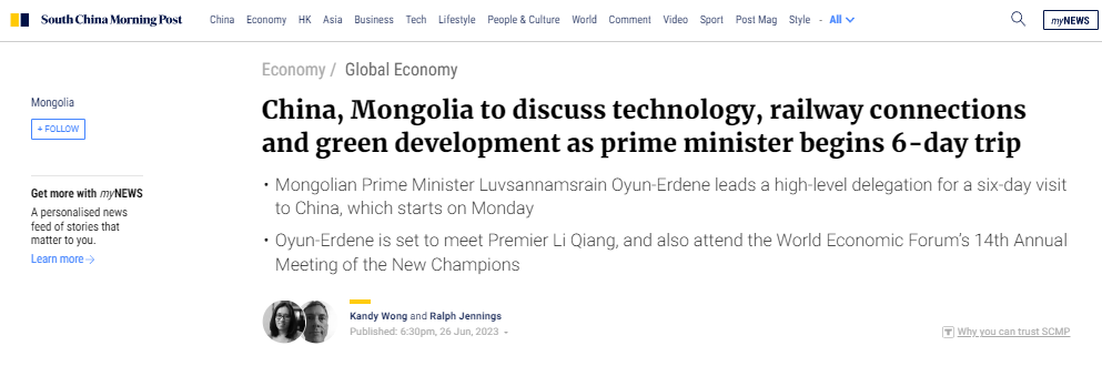 而在蒙古国总理的行程中,第十四届夏季达沃斯论坛是相当重要的一站。据《南华早报》报道,这次访问预计会加强中国和蒙古国在科学技术、铁路交通以及可持续发展等领域的合作。