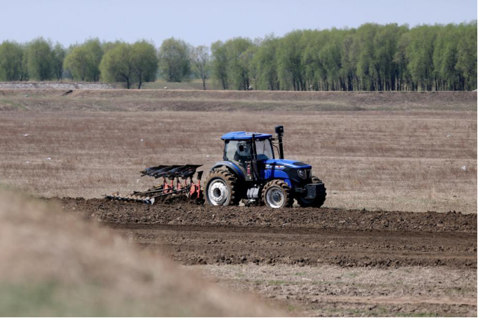 2022年4月22日,辽宁台安县达牛镇十四家子村,农机手驾驶农机翻耕农田。图|新华社记者 姚剑锋 摄