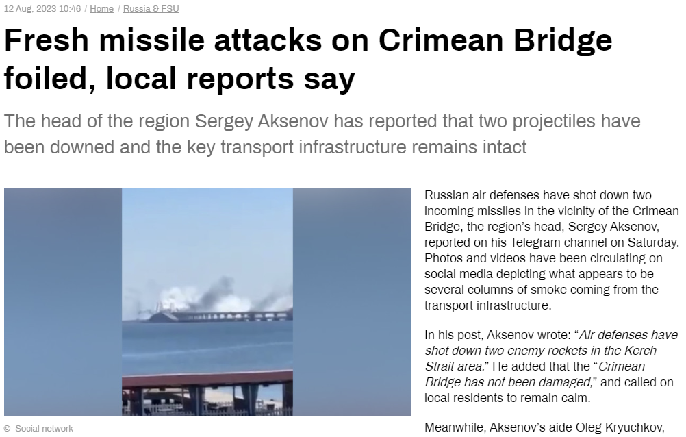 而在俄罗斯社交媒体上流传的视频显示,一座连接俄罗斯和克里米亚的大桥上方升起了烟雾。