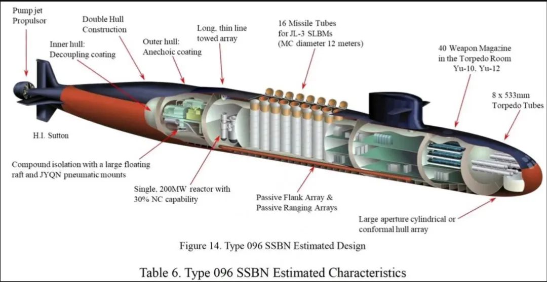 很奇怪的是,美国海军战争学院的“中国海事研究所”(China Maritime Studies Institute)这份报告给出的中国新一代核潜艇性能参数是按照不同结构给出的,这说明美方报告的逻辑基础都是推测的。哪怕有一个卫星图片,清晰度稍微好一些的话,类似于单壳体还是混合壳体的结构特征就应该能够看出来的。而美国海军战争学院直接是按照两种不同构型做出的性能参数推测,本身就是不靠谱的。美方对095和096内部结构和技术的论述,大概率是靠脑补的。