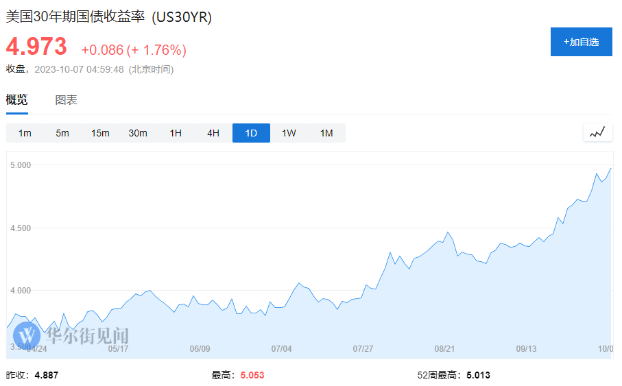其中,30年期国债收益率一度升至5.05%,10年期国债收益率超过4.88%,均为2007年以来的最高水平,股市同时剧烈动荡。