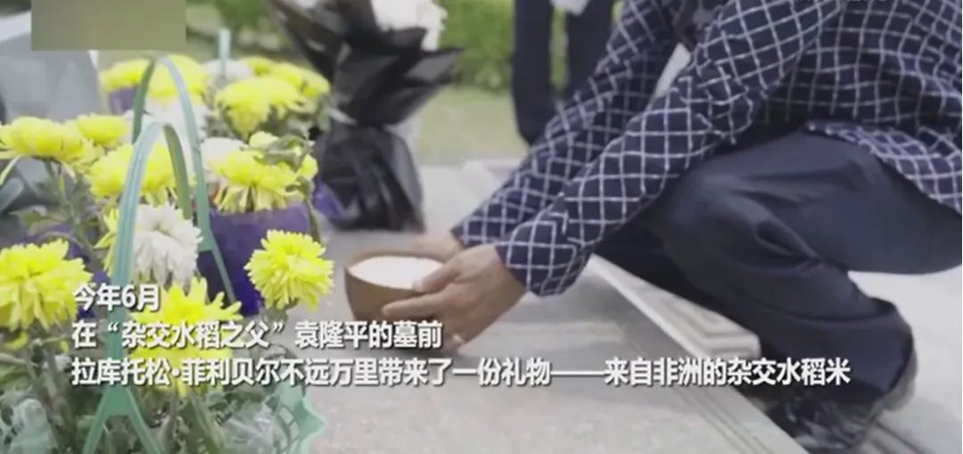 马达加斯加农业部原秘书长拉库托松·菲利贝尔在袁隆平墓前吊唁。来源/新华社视频一带一路·零距离丨中国杂交水稻的非洲味道截图