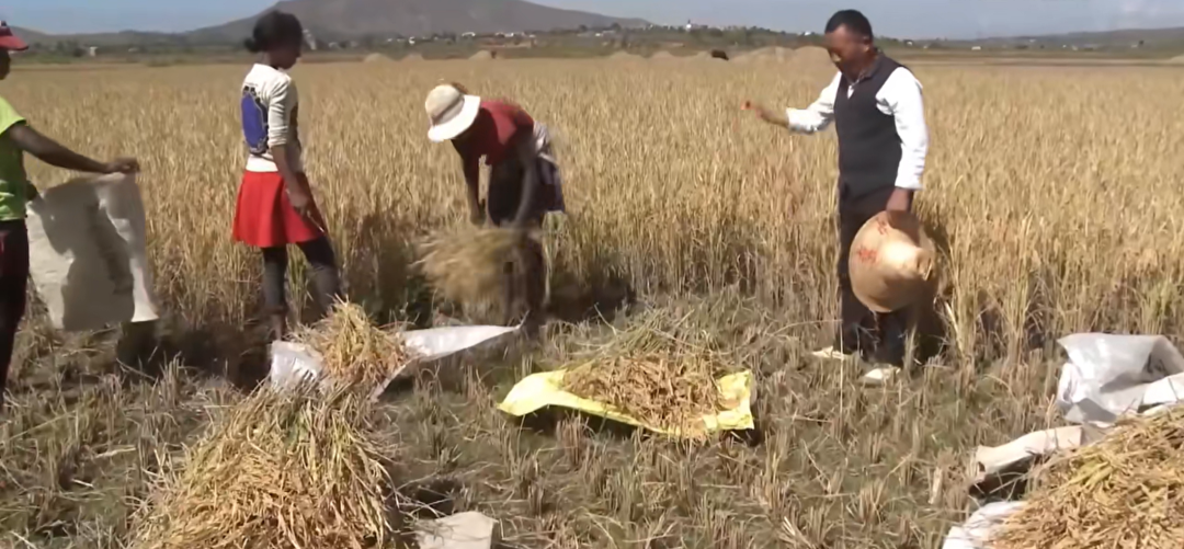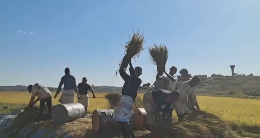 在距离马达加斯加首都35公里外的马义奇镇,中国杂交水稻专家胡月舫正与当地农民们一起抢收水稻。来源/新华社视频中国杂交水稻专家深耕马达加斯加截图