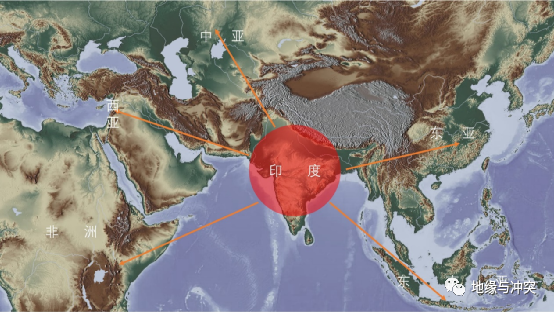 从地理位置上看,印度距离西亚、中亚、东亚、东南亚和非洲都很近,且距离相当,画个圈圈,印度就在圆心的位置。