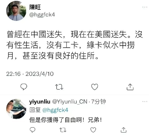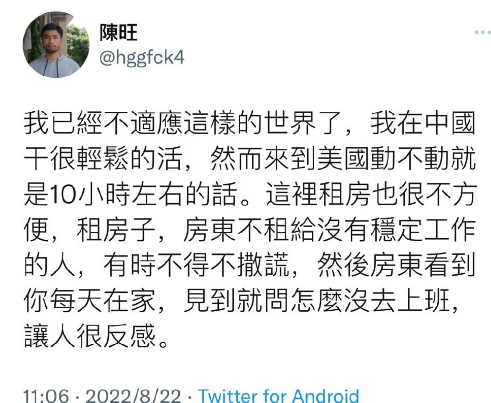 陈旺是属于那种被公知洗脑很严重的人,在国内生活其实相当不错。不过他把美国当成了人间天堂,也当成了人生的意义,并在去年润美。