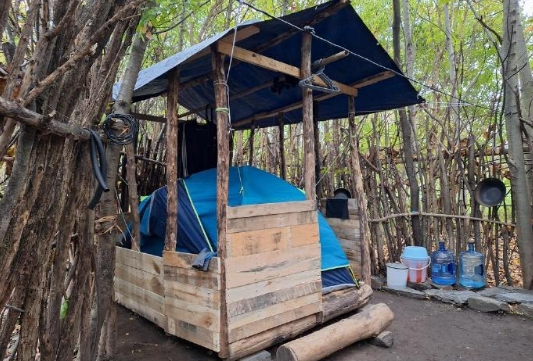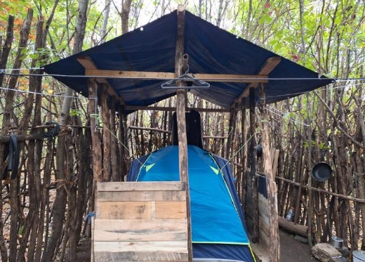 陈旺开始为长期的原始人生活作准备,在他的帐篷外面搭上篱笆。