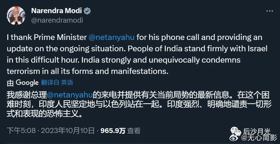 10月10日,莫迪发推,再次强调印度站在以色列一边。
