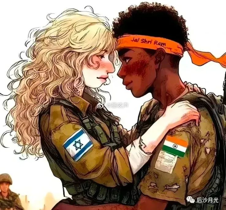 一个以色列女兵,眼神无助,委屈巴巴地抱着一个印度士兵,她身后还一名以色列士兵,暗示他们保持不了以色列女人?