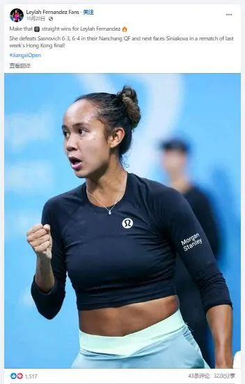 在Facebook平台,人气球员让莱拉·费尔南德斯的粉丝账号10月20日发布的“8?连胜!她在南昌QF以6比3和6比4击败萨斯诺维奇,接下来将面对在上周香港决赛中复出的西尼亚科娃!”的网帖,也获得1517次点赞、32次转发、43条评论。