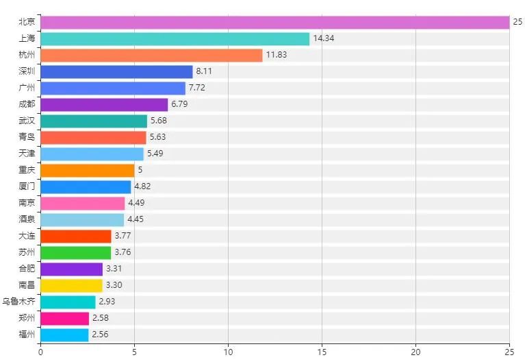 在海外影响度指标方面,排序前20的城市与海外传播度指标中所呈现的大致相同,仅是上海重新回归第二位置,景德镇和长春被郑州和佛山所取代。北京、上海处于“第一梯队”,其后为杭州、深圳、广州、成都等城市。酒泉、南昌、佛山三城首次进入前20。