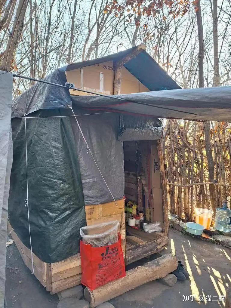 里面是这样的,看起来主体建筑层面主要是用木板做了墙壁,并用一些帐篷布做了防风,而且地板也离开地面,做了隔湿,这样的装备,加上睡袋,在春夏秋三个季度都足够维生了。