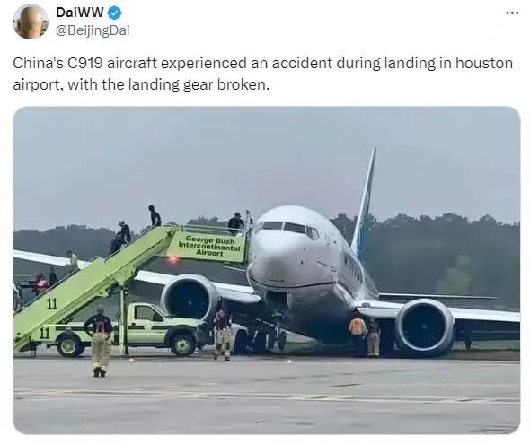 “中国的C919飞机,在休斯敦机场降落时发生事故,起落架发生断裂。”