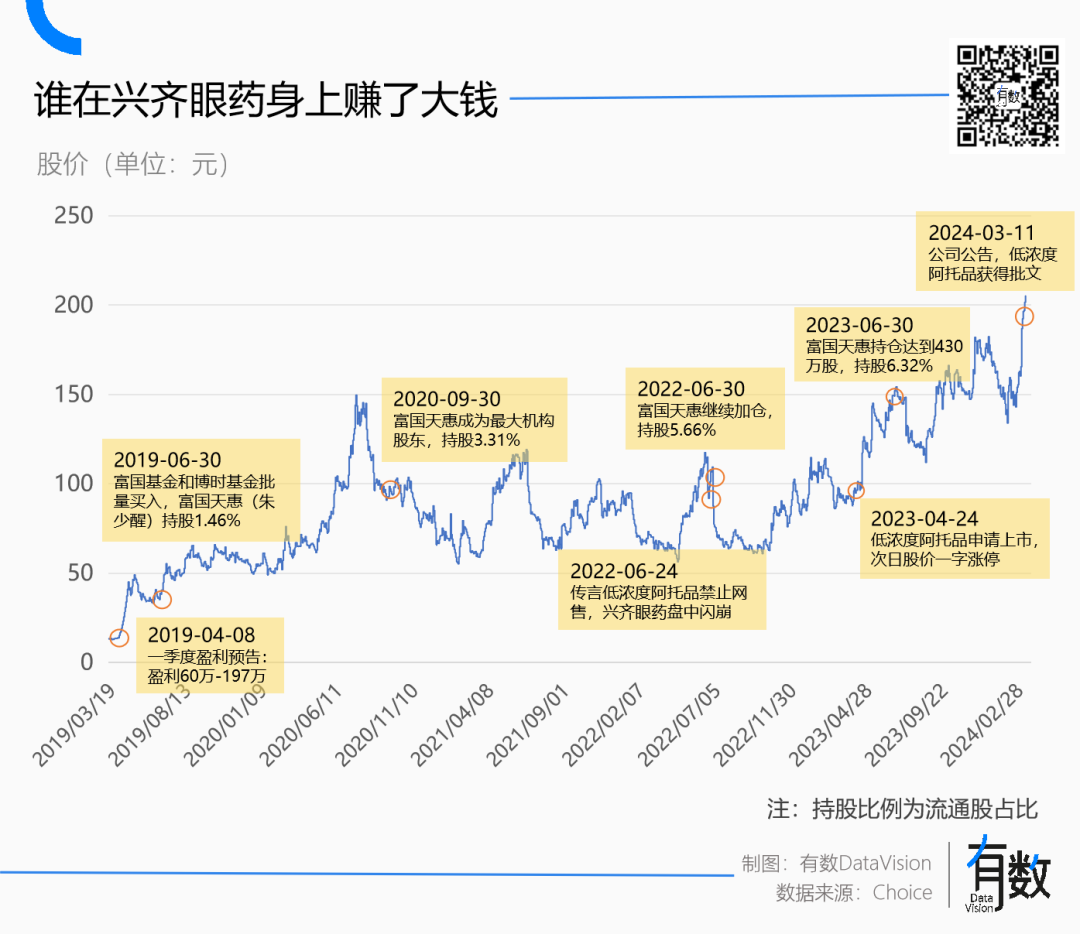 疯狂的近视神药,焦虑的中国家长 2024年3月21日 上午1:51 • 观点 低浓度阿托品——这种听上去就“少儿不宜”的药品,如今是能够和司美格鲁肽并称为“神药宇宙”中的两大顶流。 “低阿”是目前唯一经循证医学验证能有效延缓4-16岁青少年近视的药物,因此被奉为“近视神药”。围绕着它的话题早在5年前开始发酵,其“神奇”之处不外乎这几点: 效果立竿见影,比OK镜好使。“睡前滴一滴”,“半年没涨度数”; 重金难求,抢手程度连司美格鲁肽都要自叹弗如。据南方日报报道,这款眼药水曾被卖到350元一盒,在一些代购渠道甚至被炒到500至1000元一盒。 在小红书上,诸如“整个上海都买不到低阿了”的笔记遍地都是;一篇关于“低阿”的分享,就可以吸引到来自全国各地宝妈的问价。 与司美格鲁肽的故事类似,一代神药总能托起一代新王。在诺和诺德超越LV,勇夺欧洲市值冠军之后,低浓度阿托品也迎来了自己的王——来自沈阳的兴齐眼药。 那么问题来了,“近视神药”是怎么炼成的?谁是最大赢家? 疯狂的眼药水 什么是低浓度阿托品? 阿托品,这个听起来有点像某种毒品的化合物,其实是一种胆碱抑制剂,来抑制乙酰胆碱这一人体重要神经递质发挥作用。简单来说,阿托品的作用,就是让你的某些肌肉“放轻松”。 在眼科,阿托品滴眼液主要负责散瞳,也就是让睫状肌放松,方便眼科检查和手术。 而用于散瞳的阿托品滴眼液,浓度一般是1%。在临床应用当中,医生发现阿托品滴眼液可以控制青少年近视的发展,但副作用也很大——比如散瞳以后没法写作业,这难道不算额外获益? 当下流行的低浓度阿托品,一般指的是浓度为0.05%、0.01%的。 早在上世纪末,新加坡国家眼科中心开始尝试用低浓度的阿托品来防控近视。相关的试验数据发布在了国际权威的《眼科学》期刊上,奠定了0.01%阿托品的“学术基础”。 2016年,兴齐眼药拿下了新加坡国立眼科中心(SNEC)关于阿托品产品的独家权益,获得阿托品滴眼液5年的临床资料,堪称是祖师爷赏饭吃。 但心急的家长们可没有耐心等待“低阿”获批。在今年3月11日兴齐眼药公告,硫酸阿托品滴眼液获批上市之前,家长们早已通过各种途径,想方设法拿到了低阿。 而这些五花八门的途径,大致可以归纳为“海外代购”和“院内制剂”。 海外代购很好理解,主要就是去香港等地,买台湾地区和新加坡版本的低浓度阿托品。 院内制剂,则是一种限制“仅本医疗机构内使用”的“临床急需药品”,不得在院外销售。对于很多一线城市的家长来说,带娃去三甲医院配制“低阿”已经是一项例行功课。 2019年1月,兴齐眼药0.01%低浓度硫酸阿托品获得辽宁省药监部门的“院内制剂”批文,适应症为降低近距离工作引起的短暂性近视。同年12月,兴齐眼科医院取得互联网医院资质。 院内制剂+互联网医院,兴齐眼药的命运齿轮开始高速转动——线上线下同步销售,定价298元/盒、年费用3625元的滴眼液卖到脱销。仅在2019-2021年7月,兴齐眼科医院的视光诊疗收入中,来自药品的收入就从1401万元涨到了1.42亿元[5]。 但早在兴齐眼药业绩暴涨之前,兴齐眼药的股价早已一飞冲天:2019年4月10日、4月11日,兴齐眼药连续涨停,4月12日,涨停短暂回落,接下来的十个交易日,兴齐眼药连续完成了十连板,一跃成为了A股最靓的仔,总市值也从16.31亿元飙升到近50亿元。 而在此之前,兴齐眼药还不过是一家市值不到20亿元的小公司。在集齐了迈瑞医疗、恒瑞医药等明星公司的医药板块,默默无闻。 谁是最大赢家? 2019年1月29日,兴齐眼药发布公告,硫酸阿托品滴眼液获批临床。这意味着这款在小红书上爆红的“近视神药”,有了合法开卖的可能。 与此同时,富国基金的于洋和博时基金的葛晨,在研究“OK镜”(角膜塑形镜)的时候,发现了这家无人问津的小公司。 2019年春节后,A股走出了一波凌厉的逼空行情,兴齐眼药依然是个小透明。以至于两个月后的十连板横空出世,其震撼程度直接让众多医药老手傻眼。 更为市场震撼的是,兴齐眼药并没有走出和大多数妖股相似的A字走势,反而在盘整后不断创出新高。 在2019年二季报发布后,大家惊奇的发现,十大流通股东来了一个乾坤大挪移,原始股东趁机减持,而富国基金和博时基金却占据了七个席位,尤其是富国基金,更是来了一场大团购。 富国的二季报显示,总共21只基金持有兴齐眼药,持股占流通股比例高达14.73%,不乏军工、国企改革等与医药毫无关联的基金(虽然买的很少)[1]。 一时之间,基金抱团接盘的说法甚嚣尘上。毕竟重仓买入一家流通市值不超过20亿的公司,在2019年来看,就是赤裸裸的“坐庄”。尤其是富国的“头牌”朱少醒,这位老将从2019年二季度开始,始终坚守兴齐眼药(截至2023年12月31日),受到了不少财经媒体“高位接盘,廉颇老矣”的批评。 而站在2024年来看,低浓度阿托品滴眼液已经被捧上神坛,“极有可能成为中国医药历史上第一个百亿级单品。”[2] 那富国基金敢于重仓的核心逻辑,也不过就是这个百亿单品的现金流折现。从这个角度上看,A股从来不缺少美——缺少的是不近视的眼睛。毕竟,基金经理小时候还没有低浓度阿托品。 2024年3月12日,兴齐眼药盘中创下199.99元(复权后)的历史最高价。在这一刻,兴齐眼药没有套住任何人。 借用某位基金经理的话,“长舒了一口气,总算是有了一个交代。” 神药背后是焦虑 在神奇的